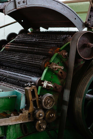 Once sufficiently loosened, the fibres are pneumatically transferred to the fearnought for a final opening and blend. As imposing as it looks, the fearnought is an extraordinary machine: powerful, precise and surprisingly elegant in motion.