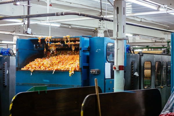 Blending is the crucial step between the Dye House and Carding: the moment when fibres are combined to match the precise shade card. During this process, fibres pass through opening machines that separate the staples and remove any remaining dirt and debris. A fine mist of lubricant is added via an atomiser to help the fibres move freely without damage.