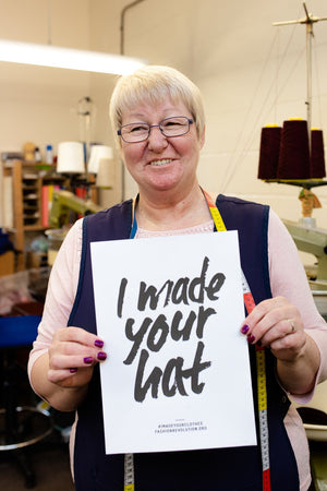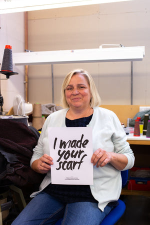 If you have one of our turbans, beanies or ear warmers, Susan probably made it! She's worked at our mill in the Scottish borders for over twenty years. She is a highly skilled hand-sewer, linker and hand-finisher.