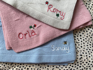 We’re delighted to offer two beautiful embroidery styles across select pieces in our baby and children’s collection. From blankets and bonnets to cardigans, each item can be personalised with initials, a name or a bespoke motif, transforming thoughtful gifts into lasting keepsakes.